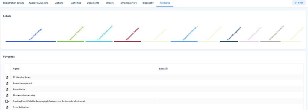 Attendees who have favorited more items appear higher in the list, helping exhibitors identify their most engaged prospects. Exhibitors can send direct messages to these attendees from this list.