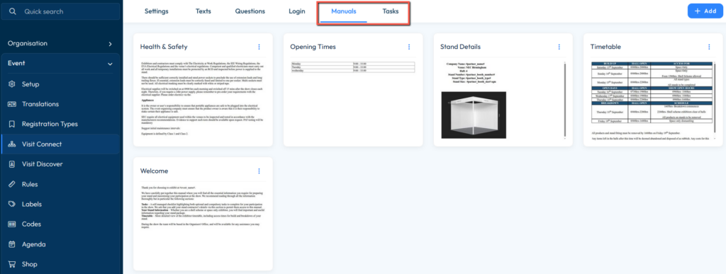 - Manual pages: Provide exhibitors with read-only event information, resources, and guidance.