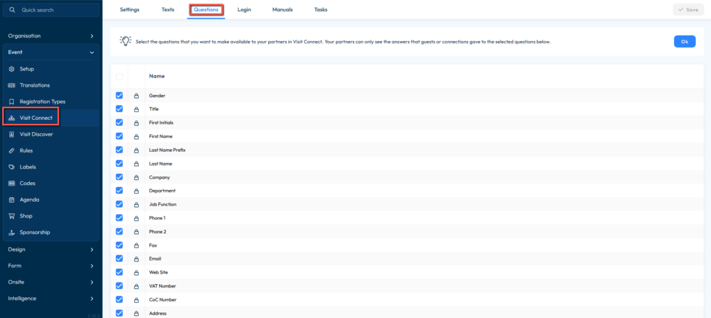 This functionality has been extended to also include system questions. Organizers can now control which standard visitor fields are shared with exhibitors when a badge is scanned and a connection is created.
