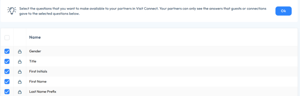 In the registration process, you can customise your own set of questions. In the Question List tab, you can select the questions that will become available for all your partners – only the registrants’ answers will appear in Visit Connect.